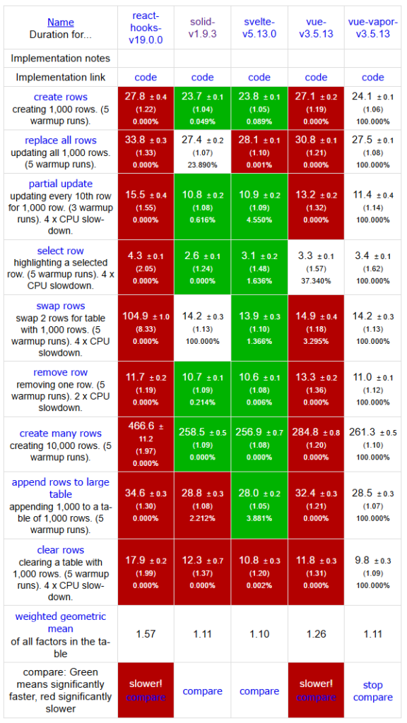 速くなるかならないか、それが一番気になるところでしょう。js-framework-benchmark の結果を見てみましょう。vue-vaporを軸にしてcompareすると以下の通りです。