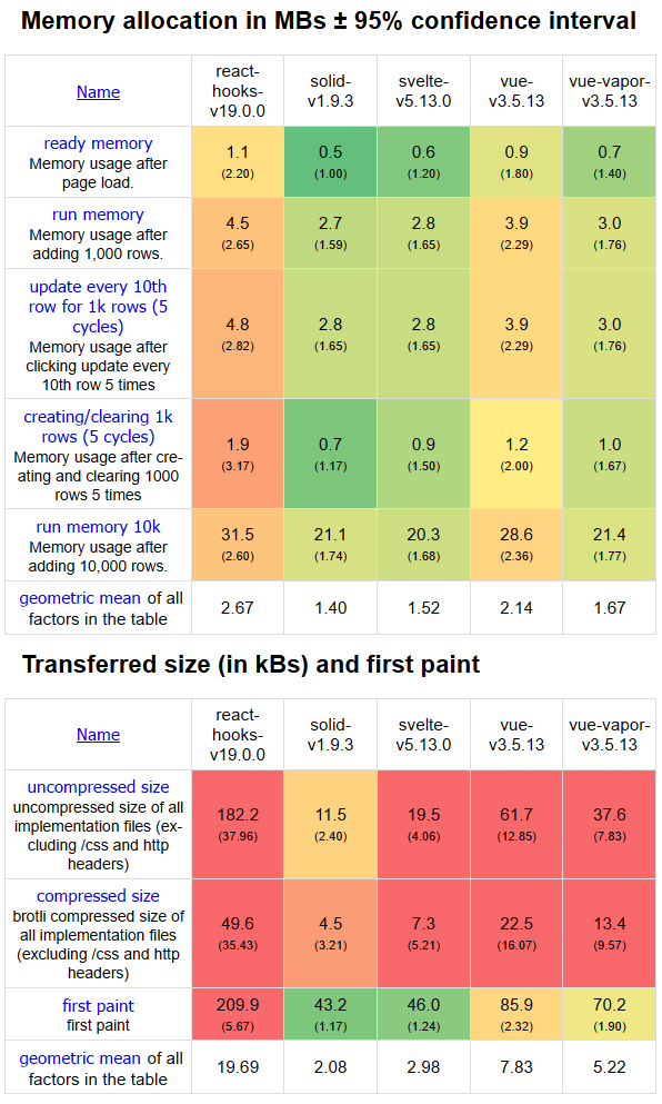 仮想DOMに割いていたメモリが削減されたおかげで、消費量が抑えられています。全体的に見てもsolid, svelteとほぼ同水準まで下がっています。転送サイズについてはさすがにsolidには遠く及びませんが、compressed sizeはそこそこ健闘してるといったところでしょうか。早くなったとはいえ、first paintがまだ遅いですね。この辺りは3.6正式版のベンチマークで改善がみられるか期待したいですね。