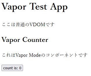 今までのVueでは仮想DOMを用いてDOMの変更を行っていましたが、Vapor Modeでは仮想DOMを廃止し、solid.js と同様にDOMを直接操作します。ただしコンポーネントの実装においては、これまでと変わらない .vue ファイルで、 refcomputed がいつも通り使えます。